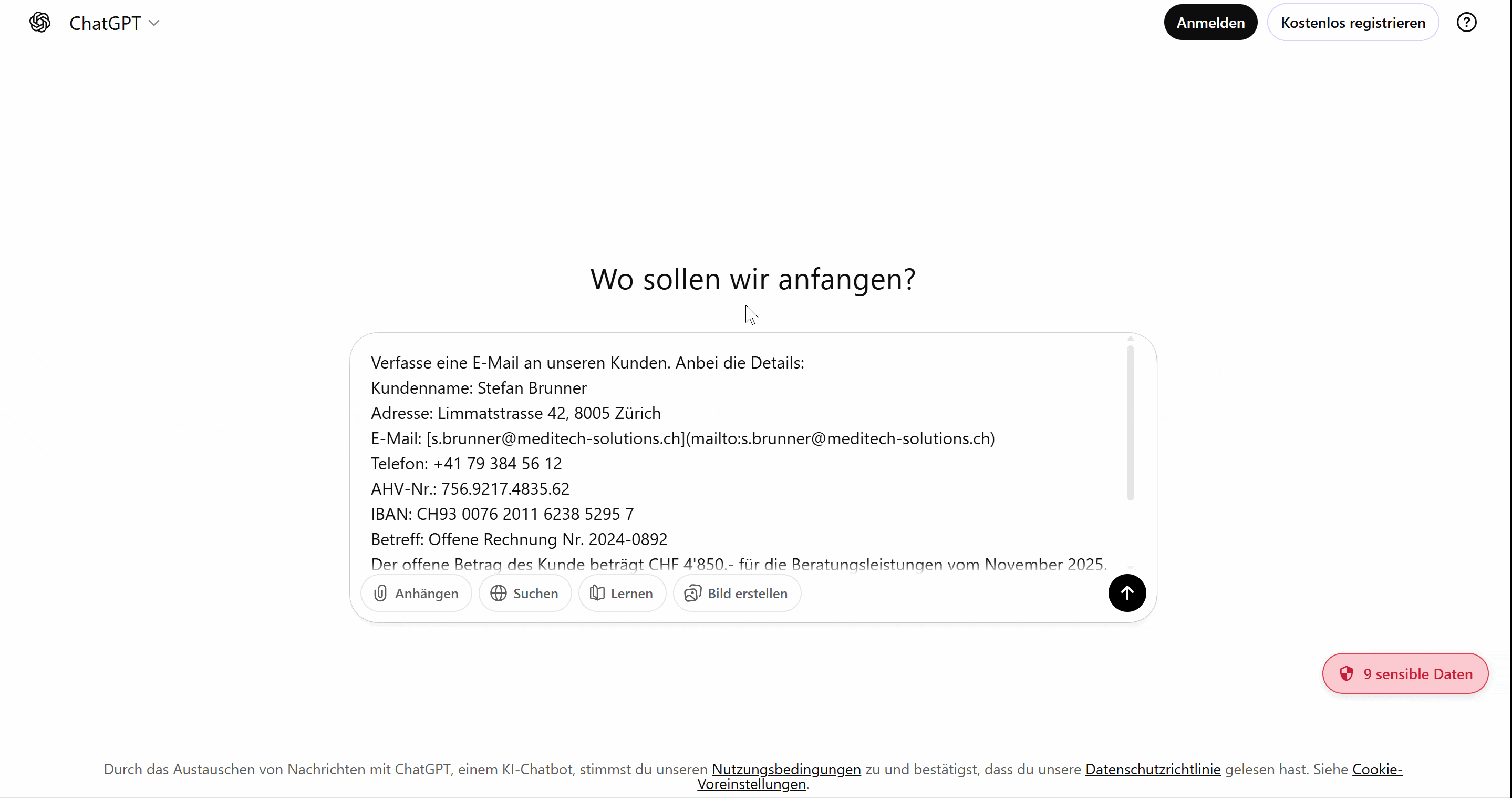 Mitarbeitende greifen auf externe KI-Tools zurück, auch wenn interne Richtlinien dies untersagen. Sensible Inhalte werden dabei häufig unverschlüsselt ausserhalb der Schweiz verarbeitet. Die Datenhoheit liegt nicht mehr bei Ihnen.